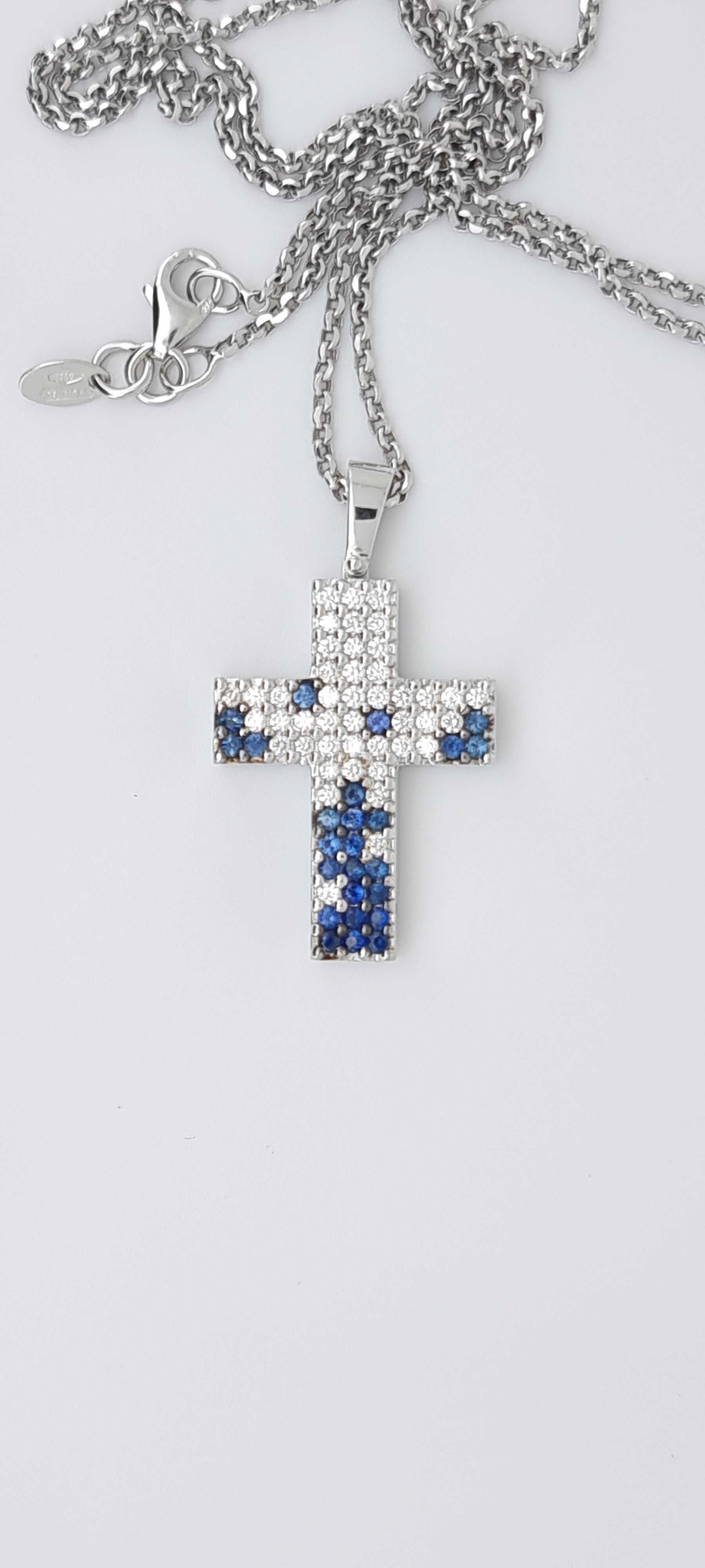 Aurelia - White gold (18K) necklace with cross-shaped pendant, with Natural Diamonds and Natural Sapphires