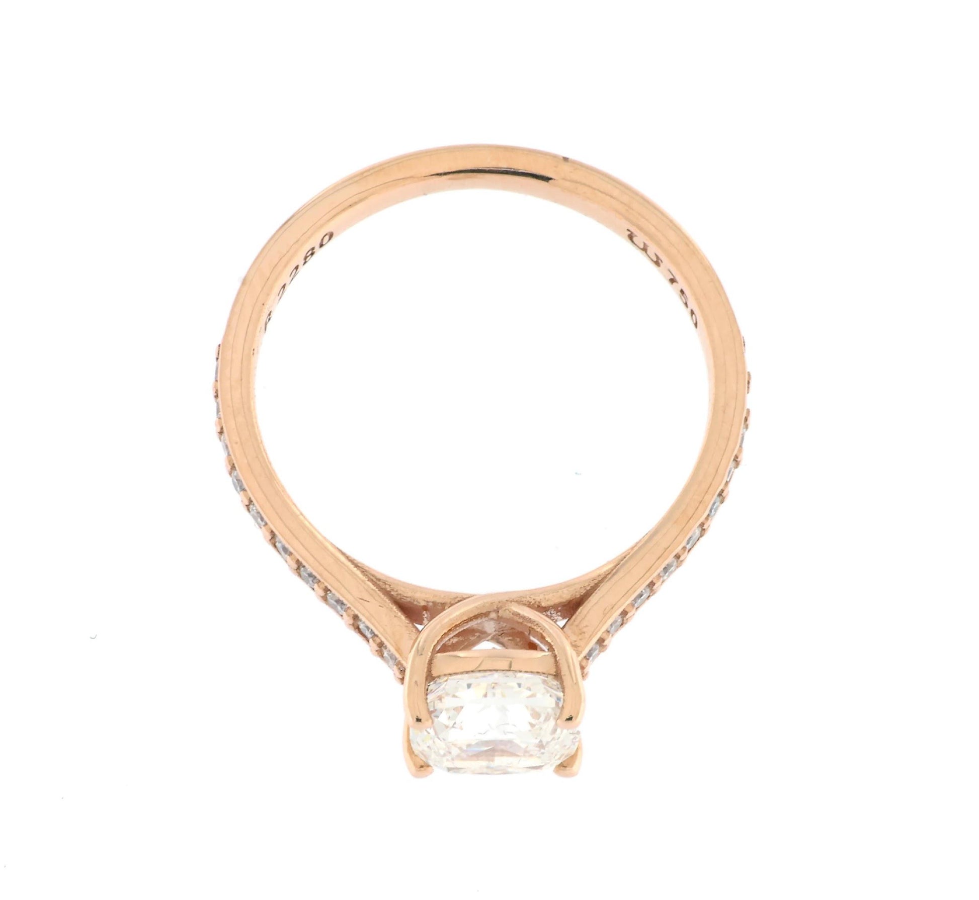 The shank, embellished with a delicate pavé of natural diamonds, draws the eye to the center of the ring, creating a continuous and refined light effect. The warm and enveloping rose gold gives the jewel a sophisticated and romantic elegance, enhancing the brightness of the gems and making it unique.